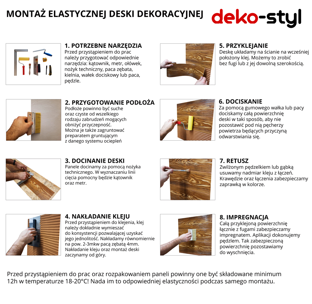 Uwaga – aklimatyzacja produktu: przed montażem deski należy składować minimum 12 godzin w temperaturze 18–20°C, aby uzyskać odpowiednią elastyczność.